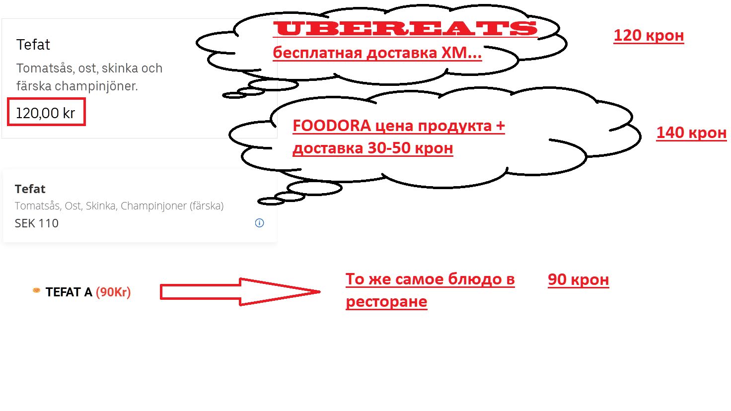 Ubereats рекламирует бесплатную доставку. Как видим, тупо на сайте накинули 30 крон (примерно 3 евро) и выдают свою цену за цену поставщика.